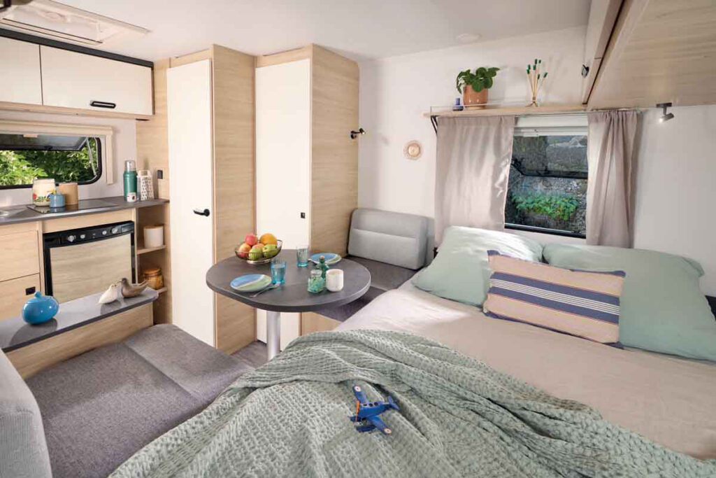 Con i suoi 3,50 metri di lunghezza interna, la roulotte EASY 350CP è il modello più compatto e facile da trainare della nostra gamma. Grazie alle tre configurazioni per la zona notte, si adatta bene a tutte le vostre esigenze.
