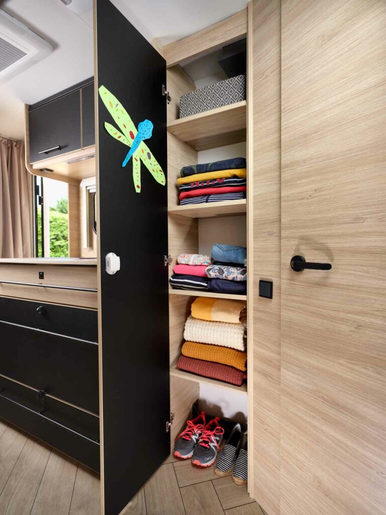 Con i suoi due letti a castello posteriori, un grande letto fisso anteriore e una dinette trasformabile, la 496PE offre una grande capacità di accoglienza senza sacrificare il comfort. Nessun letto faccia a faccia, una circolazione fluida, un bagno ben attrezzato, un materasso di 15 cm e un frigorifero XL: tutto è riunito per viaggiare in famiglia in un ambiente luminoso, pratico e ben strutturato.